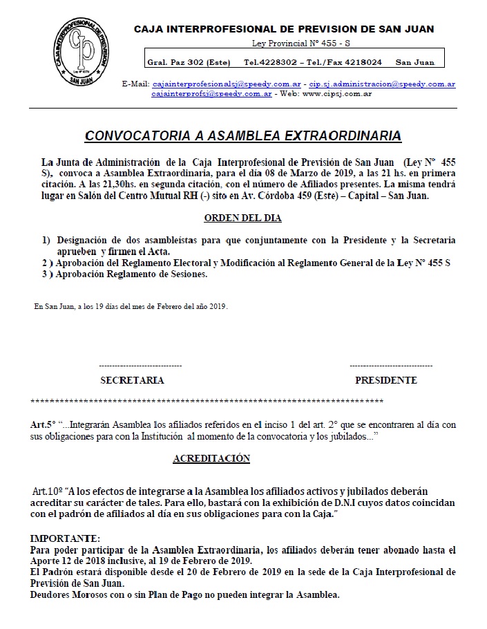 Asamblea Extraordinaria 08 de marzo de 2019 Públicado en 20/02/201920/02/2019 por admin Documentos para descargar: MODIFICACION AL REGLAMENTO GENERAL DE LA LEY Nº 6374 REGLAMENTO DE SESIONES REGLAMENTO ELECTORAL